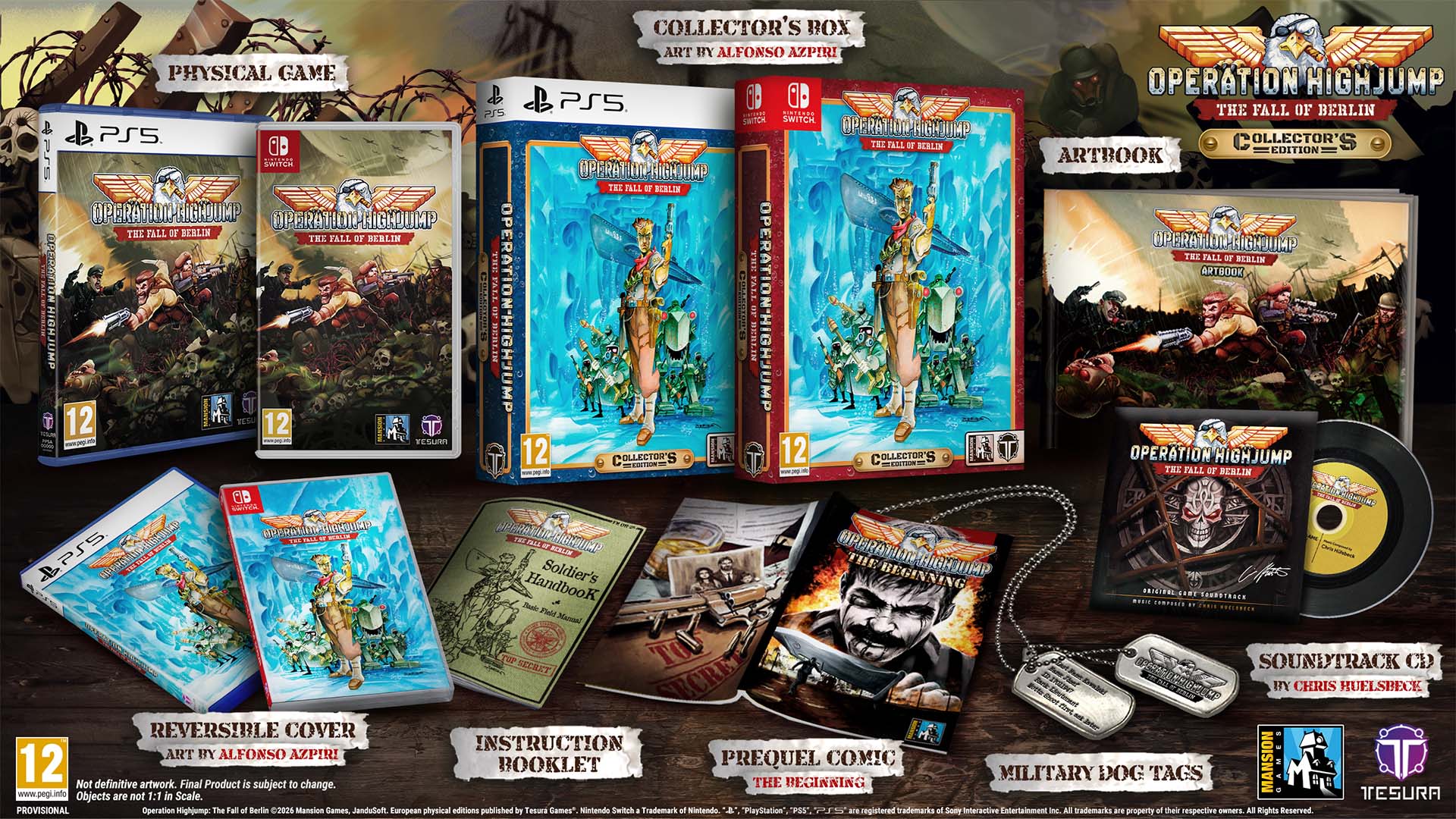 ● Operation Highjump: The Fall of Berlin «Collector’s Edition» (PS5) incluye: Juego Físico (PS5) + Carátula Reversible (Arte de Alfonso Azpiri) + Manual de Instrucciones; «The Beginning» Cómic; Chapas de Identificación Militar; Banda Sonora Original de Chris Hülsbeck; Libro de Arte; y Caja de Coleccionista (Arte de Alfonso Azpiri).